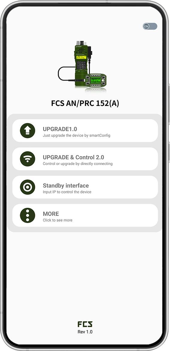Wirelessly upgrade the firmware of the FCS AN/PRC 152(A) radio via the FCS RCU software. Download the upgrade firmware to the smartphone inside the official website to upgrade the FCS AN/PRC 152(A) radio to the latest firmware version.